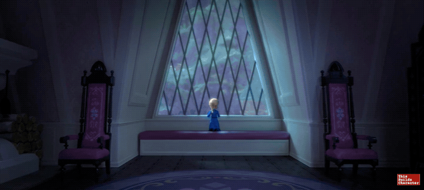 Then the camera pulls back to show Elsa’s room, frozen in anguish. Flurries drift down in the frame, and ice radiates along the floor and the walls from her body. Her grief made manifest.