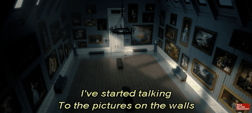 When Anna begins talking to the art in the gallery, note the closed door behind her. She’s bouncing off the walls with energy, but kept contained in the space.