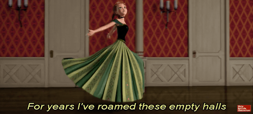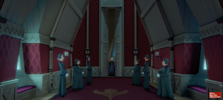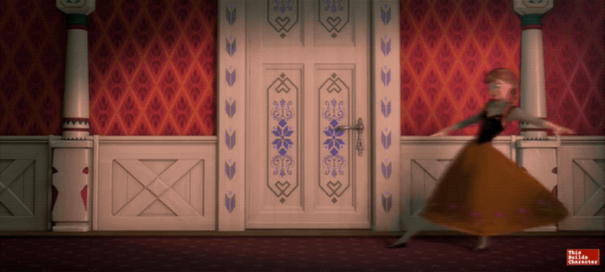 Anna runs past a hallway full of shut doors as she sings about lonely halls, then slides through a doorway into a ballroom. Her kinetic frenzy is in sharp contrast to her earlier moment where she ground to a halt in front of Elsa’s locked bedroom door.