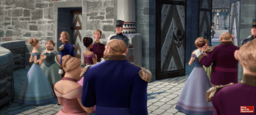 The people are moving into the castle for the coronation with ease and joyful anticipation, while Anna’s joy comes from escape. Even in a small way, she’s still struggling in this shot to move away from the place that kept her shut away for so long.