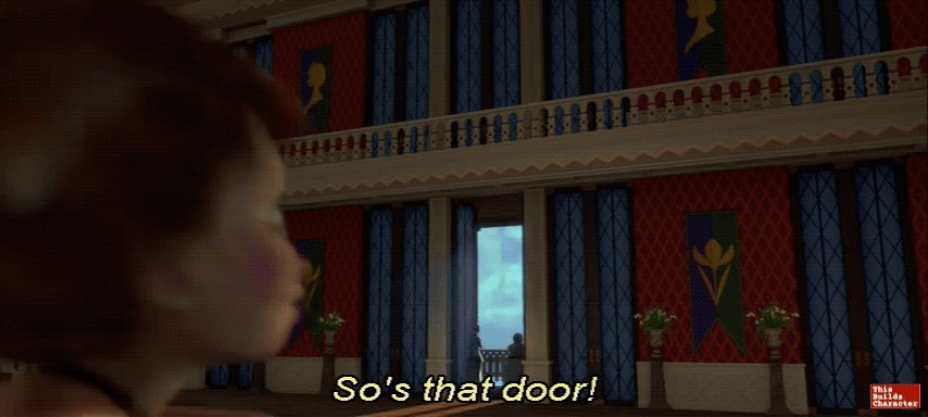 And there’s that contrast again: The shadowy world of the palace sees a crack in that darkness split open by the light spilling in from the giant door in the center of the frame. And Anna is right there, rushing out toward the light.