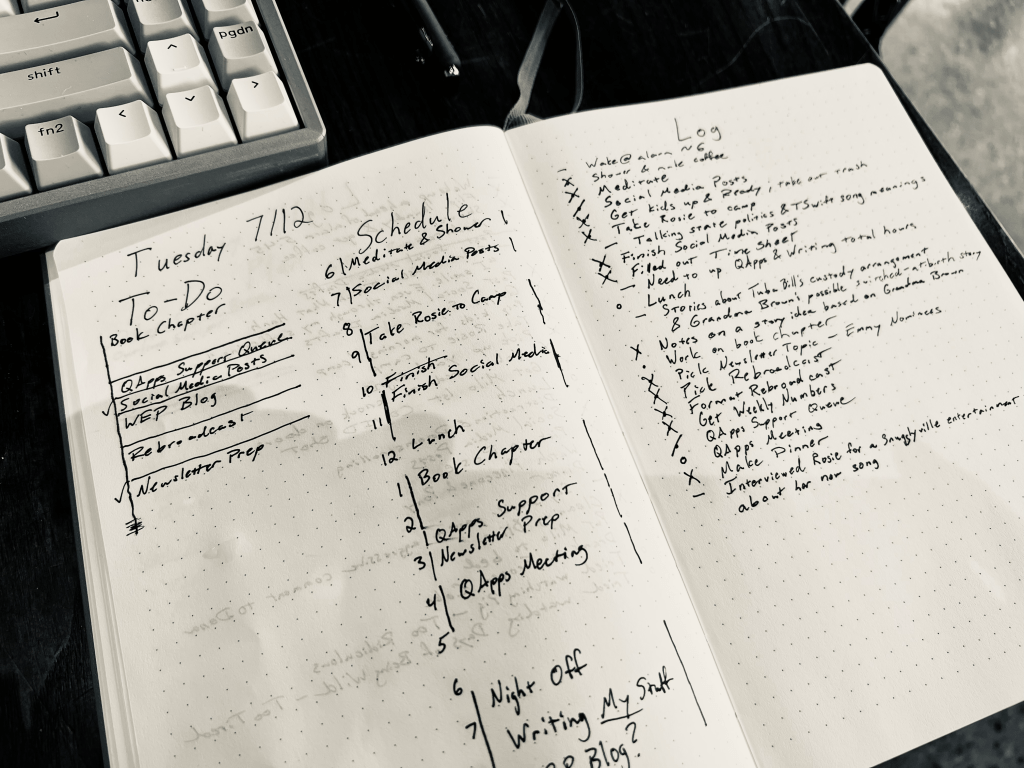 The other is to make sure I know where my time goes, and to remind me that I have more time than I think, but not enough time for everything. That’s the notebook.